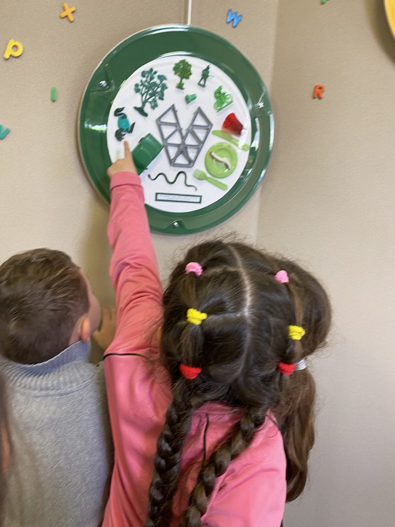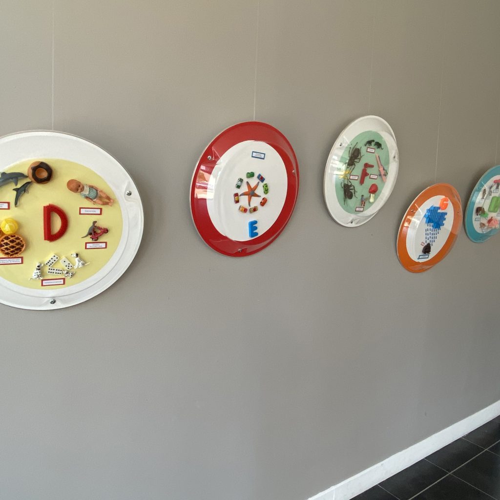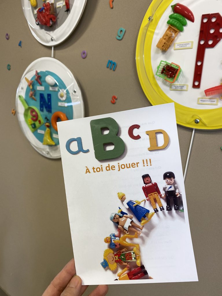 Chaque vitrine présente des saynètes de l’album composées avec des jouets ainsi, qu’en son centre, la lettre de l’alphabet